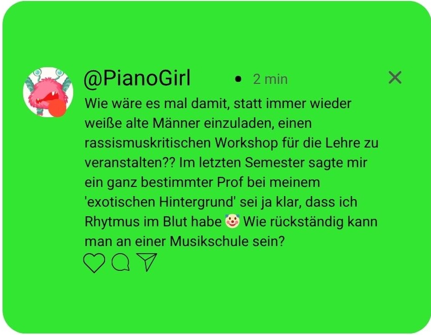 Über einen alteingesessenen Professor der Musikhochschule werden immer wieder Beschwerden eingereicht: sein Unterrichtstil sei zu konservativ, außerdem mache er häufig Bemerkungen über das Geschlecht oder die Herkunft der Schüler*innen. Unter einem Ankündigungspost für das nächste Hochschulkonzert bei Instagram bildet sich Unmut über den Lehrkörper der Hochschule. Es kursiert ein offener Brief unter den Studierenden, ein studentisch geführtes Radio veröffentlicht einen Beitrag unter dem Titel Wie sicher ist unsere Musikhochschule?, der von einigen Angehörigen der Szene bei Instagram und X geteilt wird. Die Hochschulleitung nimmt die Vorwürfe zur Kenntnis, der Professor entschuldigt sich in einem öffentlichen Rundbrief bei den Studierenden für sein grenzüberschreitendes Verhalten. Er wolle sich in dem Bereich durch ein Coaching sensibiliseren lassen. Wie reagierst du auf die Kommentare bei Instagram?